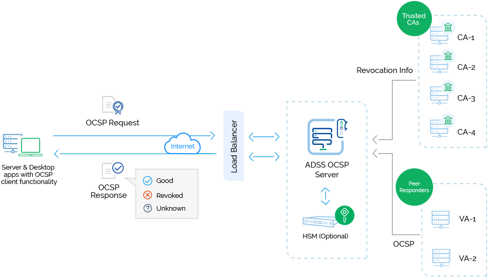 – ADSS OCSP Server supports multiple CAs and validation policies. Additionally, it supports role-based operator access controls and provides high availability configurations. OCSP server certificates can be issued using a built-in CA and auto renewed.